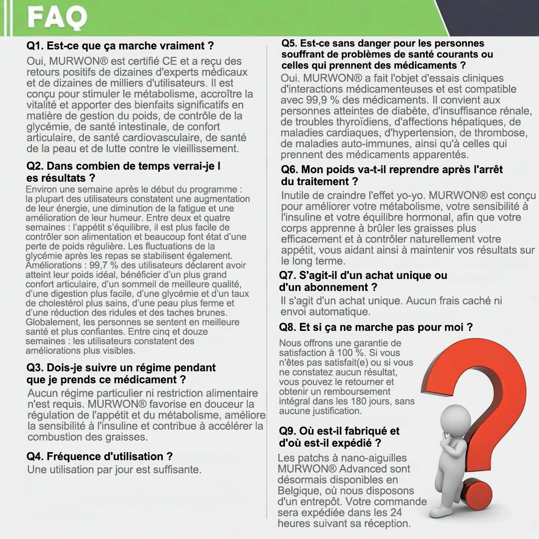 đŽđđwonÂźđŽđđđđ§đ đ · đœđđ§đĂ©đ§đđđ ĂđđŒđ+ đ0-đđ-đ đđđ©đđ đđđđ§đ€đŁĂ©đđ đđ đšđđđ§đĂ© đđđđ a Ă©tĂ© dĂ©veloppĂ© aprĂšs plus de 20 ans de recherche par une Ă©quipe multidisciplinaire de plus de 30 experts. Chaque patch intĂšgre une architecture de microneedles ultra-fines mesurant environ un septiĂšme de l'Ă©paisseur d'un cheveu humain, conçu pour garantir une application douce et pratiquement indolore. La formulation contient des composĂ©s bioactifs naturels hautement concentrĂ©s, jusqu'Ă 20 fois plus Ă©levĂ©s que les niveaux conventionnels du marchĂ©, y compris le Moringa et la BerbĂ©rine, qui agissent de maniĂšre synergique pour soutenir des rĂ©ponses glycĂ©miques saines, la rĂ©gulation de l'appĂ©tit et le mĂ©tabolisme des lipides, favorisant ainsi une gestion du poids progressive et durable. Enrichi en NAD+, le patch soutient Ă©galement la fermetĂ© de la peau et la rĂ©silience structurelle lors des fluctuations de poids corporel, aidant Ă maintenir une apparence affinĂ©e sans compromettre le confort ou l'esthĂ©tique. Des composants supplĂ©mentaires Ă haute efficacitĂ© contribuent au soutien de la fonction immunitaire, de la santĂ© digestive, de l'Ă©quilibre intestinal, de la santĂ© des femmes, des niveaux d'Ă©nergie quotidiens et Ă la rĂ©duction de la fatigue, favorisant collectivement un Ă©tat physiologique plus jeune et plus rĂ©silient de l'intĂ©rieur. Ce produit respecte les normes de qualitĂ© de l'Organisation de Discussion sur la SantĂ© de Belgique et ne nĂ©cessite aucune injection. BasĂ© sur des principes scientifiques, il offre une approche sĂ»re et complĂšte pour contrĂŽler efficacement le poids et promouvoir la santĂ© mĂ©tabolique Ă long terme, conçu pour travailler en harmonie avec le corps plutĂŽt que contre lui.
